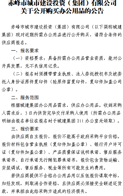赤峰市城市建設(shè)投資(集團)有限公司 關(guān)于公開購買辦公用品的公告