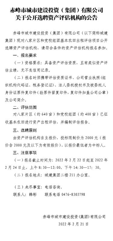赤峰市城市建設(shè)投資(集團)有限公司 關(guān)于公開選聘資產(chǎn)評估機構(gòu)的公告