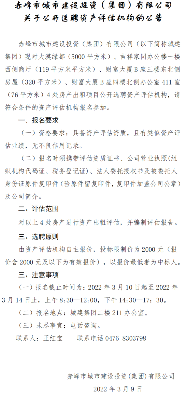 上一篇:赤峰市城市建設(shè)投資(集團(tuán))有限公司 關(guān)于公開(kāi)選聘資產(chǎn)評(píng)估機(jī)構(gòu)的公告